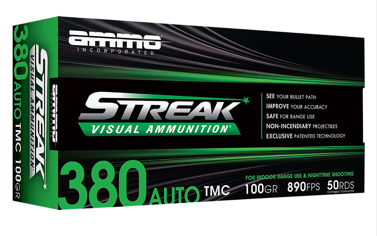 This is a 50 round box of 380Auto 100 grain TMC STREAK VISUAL AMMUNITION.