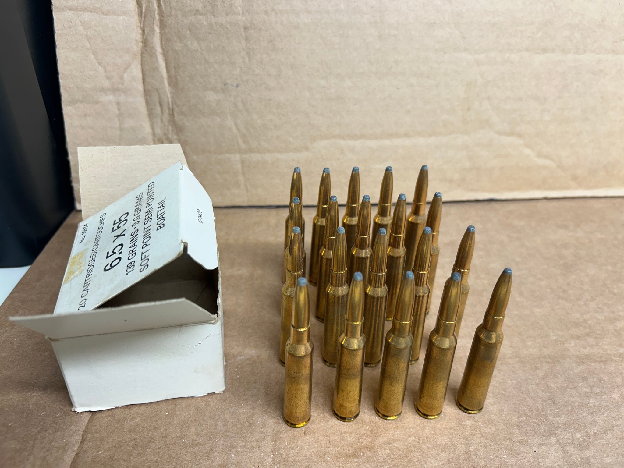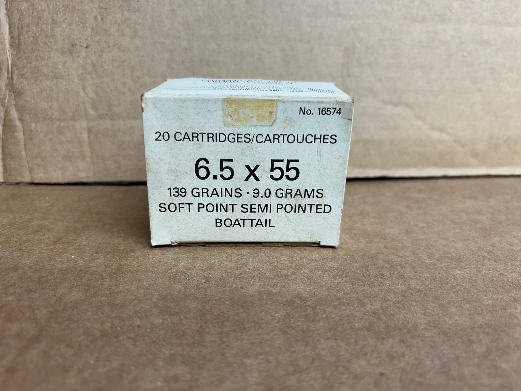 6.5 x 55 139 grain soft point semi pointed boattail 20 rounds.