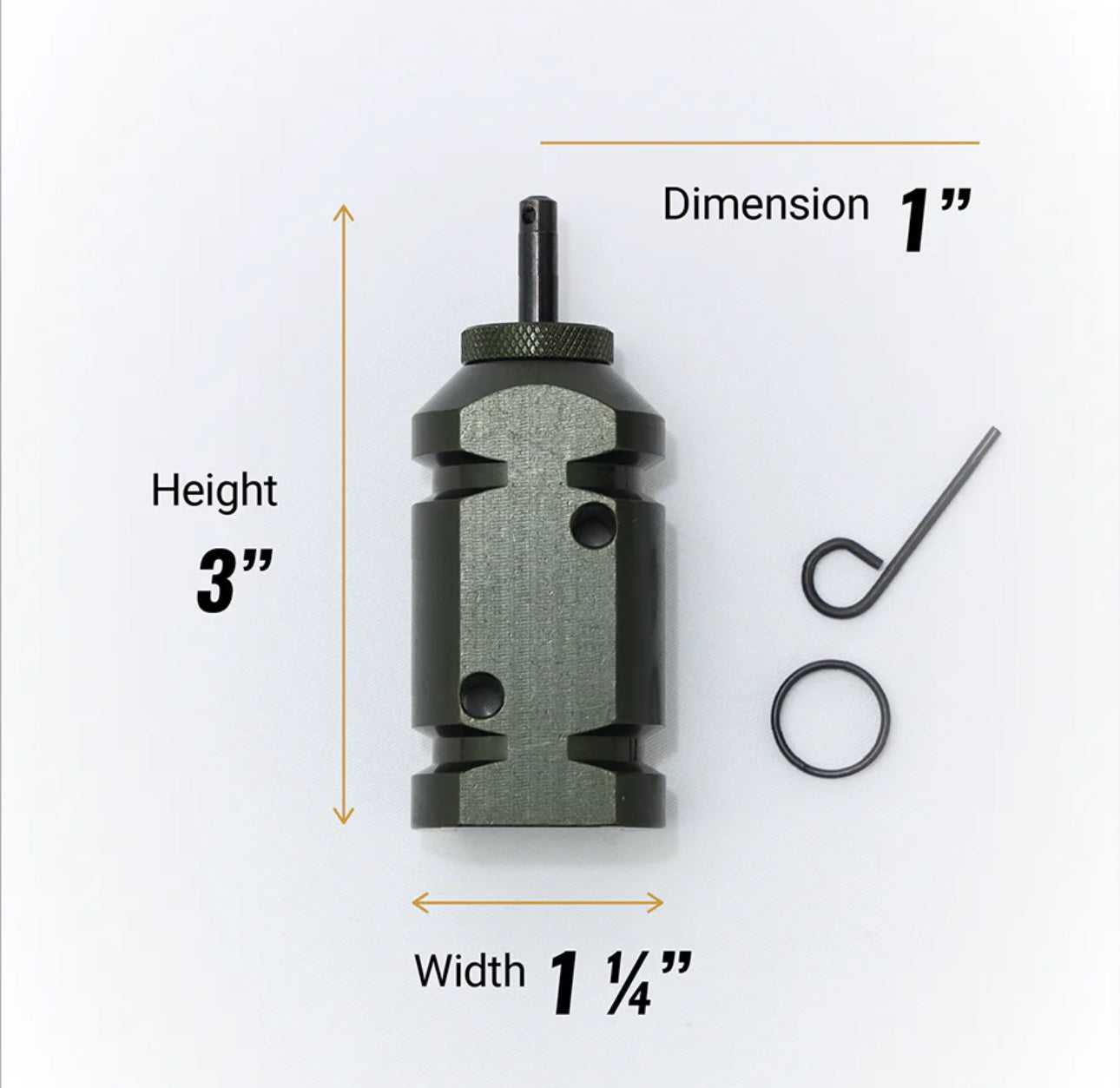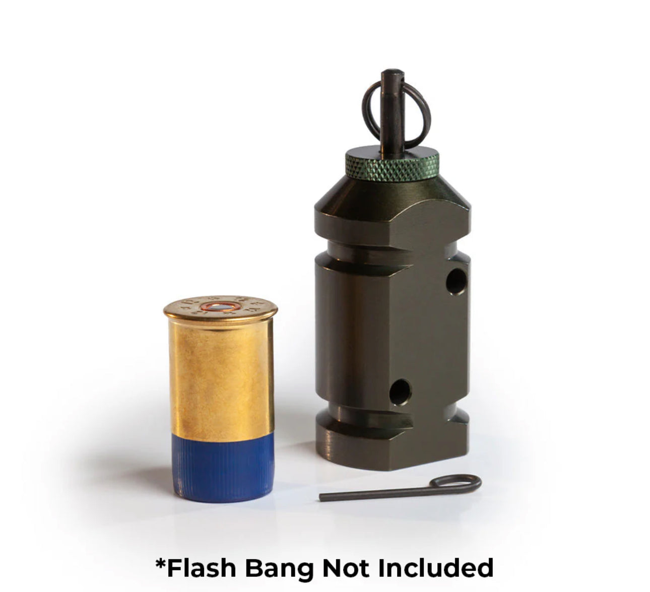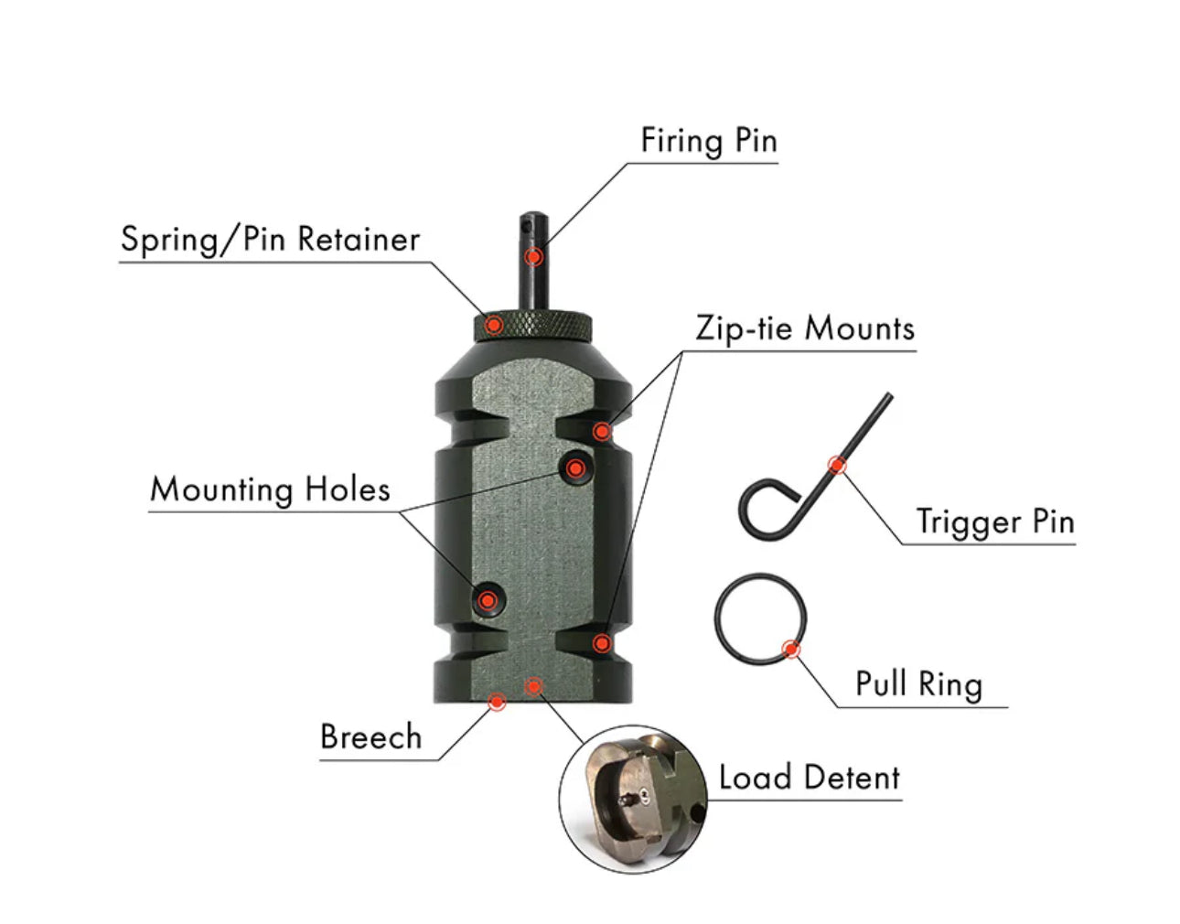 Our Gen3 12 gauge perimeter trip alarm. Made of 6061 Aluminum, this unit utilizes a spring-loaded firing mechanism and a trip trigger. When the trigger pin is disturbed while loaded with a 12 gauge Flash Bang/Training Blank, the unit will discharge. This device is compatible with blanks, adapters, flares and pepper gas depending on situation and requirement.