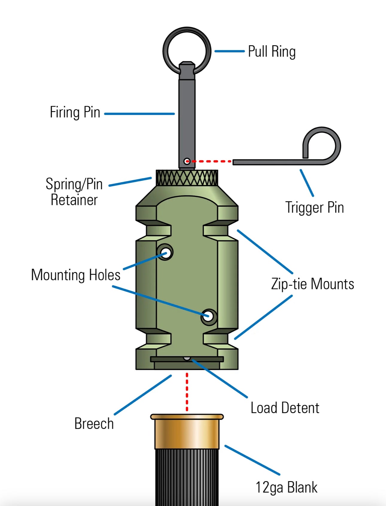 The FithOps perimeter trip alarm is made of 6061 Aluminum, the unit utilizes a spring loaded firing mechanism and a trip trigger. When the trigger is disturbed while loaded the unit will discharge. This kit comes with the 12g device and three FithOps adapters.