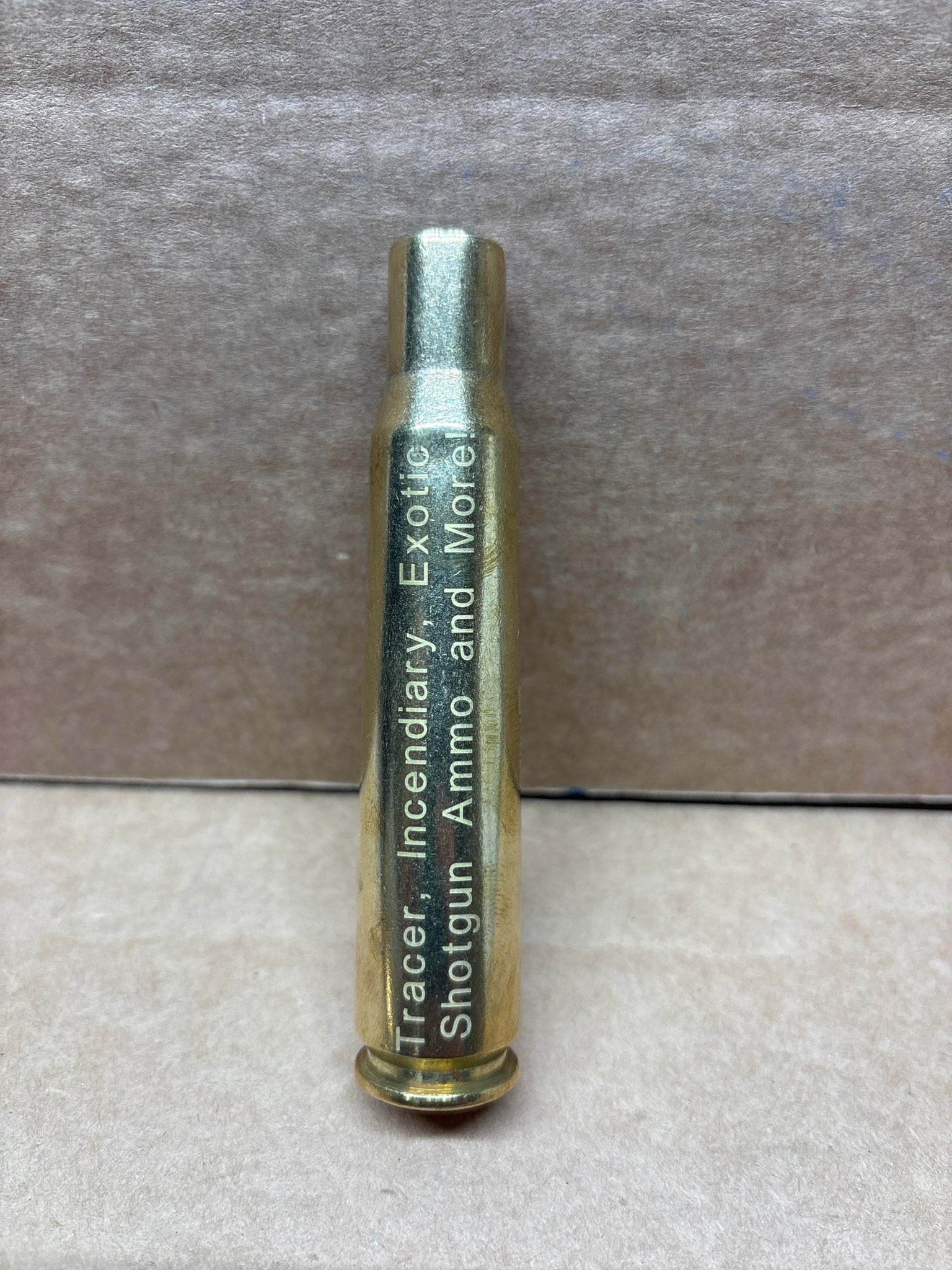 This is one 50 BMG case that has been engraved with our Logo, website name, QR code and “Tracer, Incendiary, Exotic Shotgun Ammo and More!”